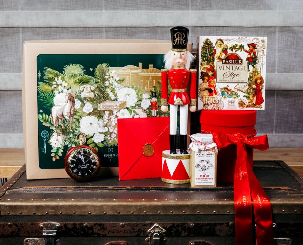 A co powiesz na rozbudowany box świąteczny, pełny włoskich ciasteczek cantuccini w towarzystwie herbaty Basilur, która przenosi w wspaniały czas wspomnień? W zestawie znajdziesz też swojski wieloziarnisty chleb do własnego wypieku, ekskluzywne wino Primitivo Gran Sasso z włoskiego regionu oraz prawdziwy podlaski smalec naszego Szefa Kuchni. I w tym boxie nad smakołykami góruje czerwona figurka dziadka do orzechów, a całość zamknęliśmy w przepięknym pudełku z autorską grafiką Anity Tomali. To kunsztowny box na miarę wyjątkowej osoby.